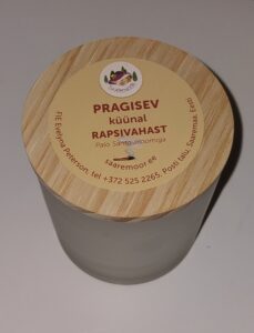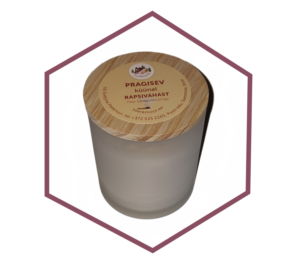 Pragisev rapsivahast küünal puidust kaanega vormis, Palo Santi aroomiga.